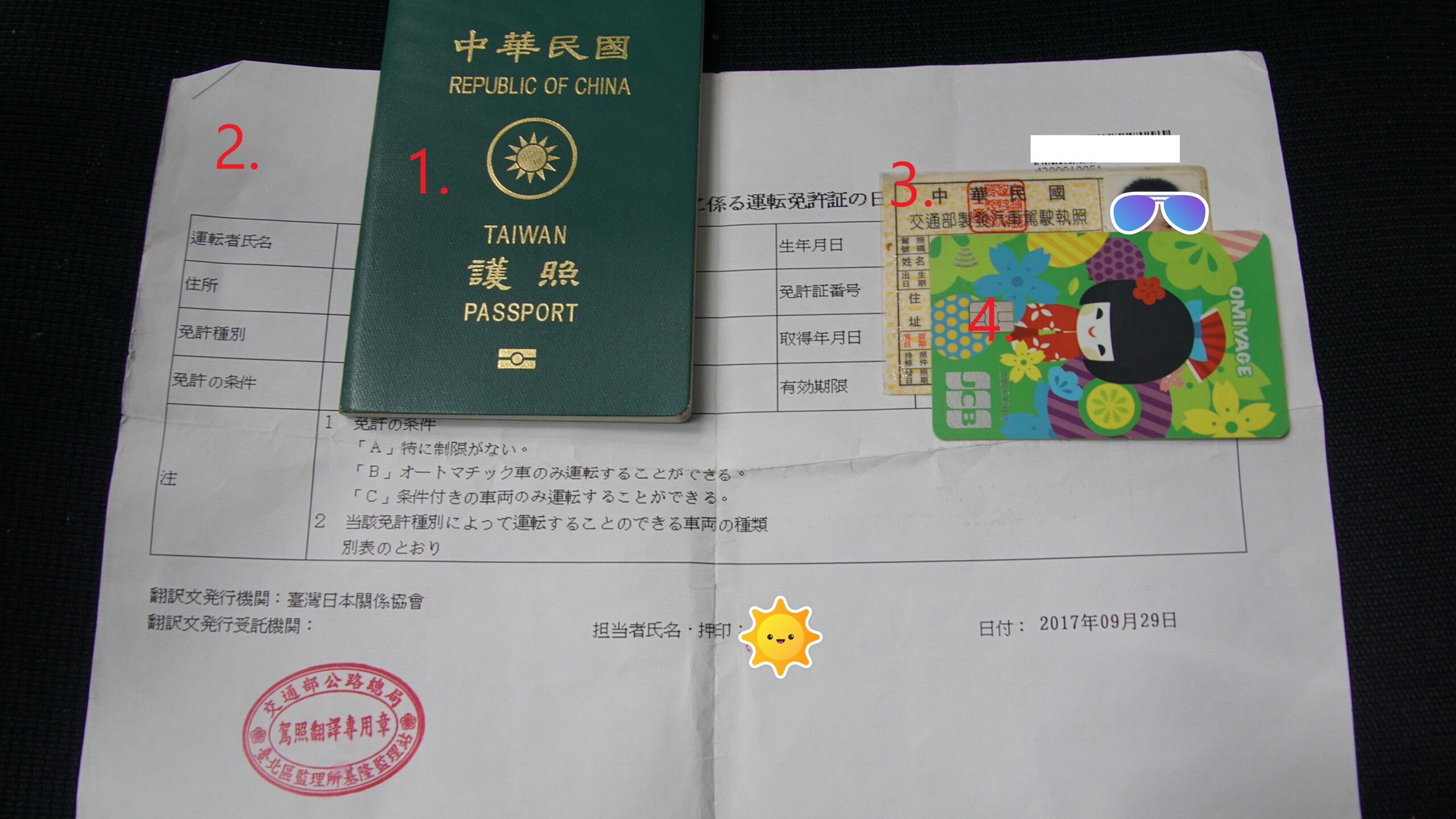 在日本租車必須持有以下4種文件及物品:1.日本駕照譯本 2.國內駕照正本 3.護照 4.信用卡;台灣地區來的朋友,根據台日駕照互惠,出發前先至各地監理站憑駕照&身份證更換『機車日文駕照譯本』,在持譯本,正本,以及護照,就可以在日本合法的騎車了!譯本有一年的時效!